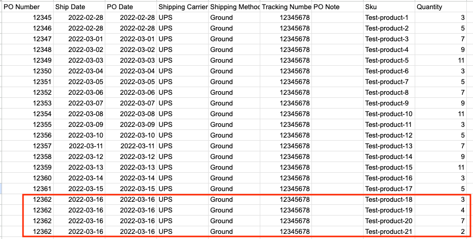Repeat the same carton/PO number across multiple rows—one per SKU.